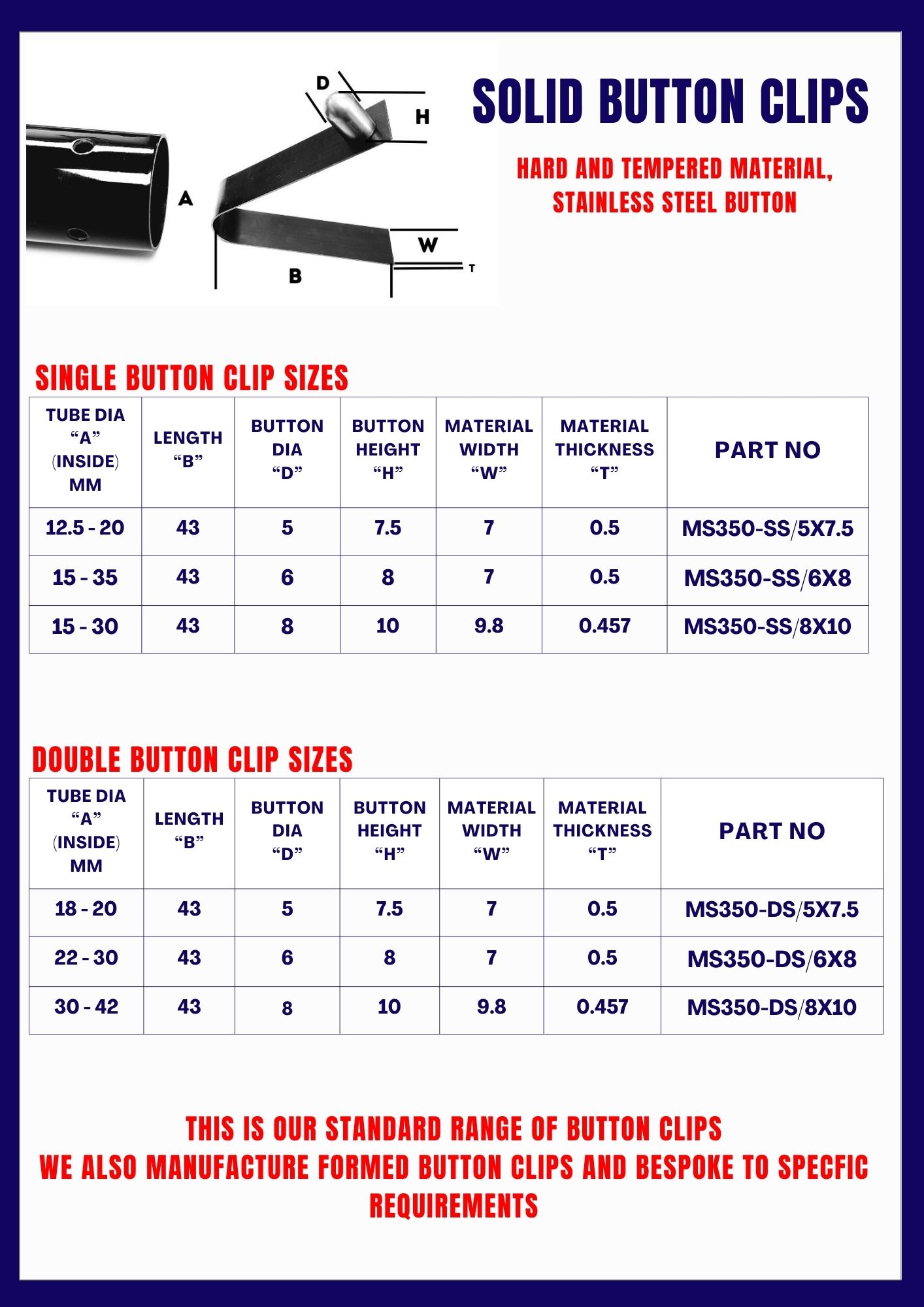 Solid Button Clips are manufactured from Hard and Tempered Steel and fitted with a Stainless Steel Button.